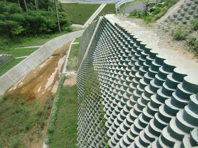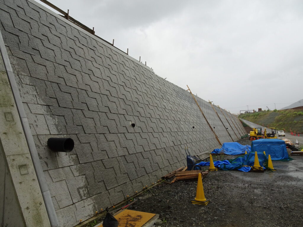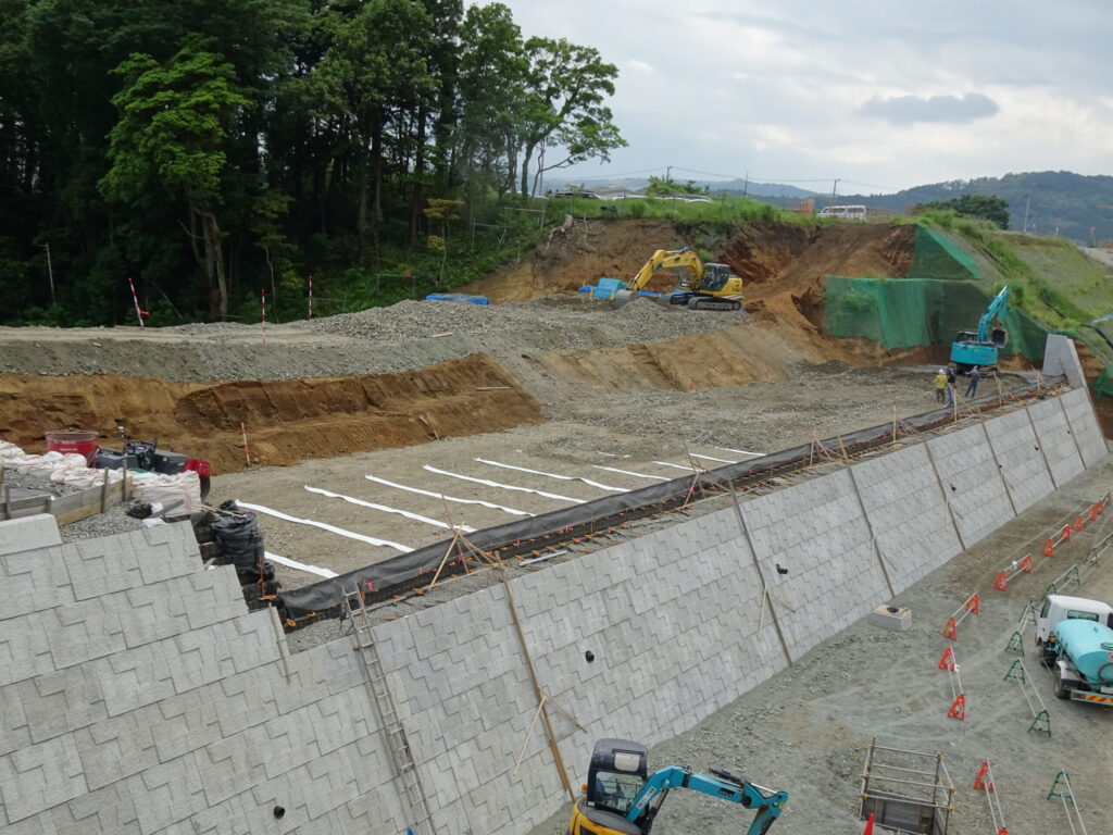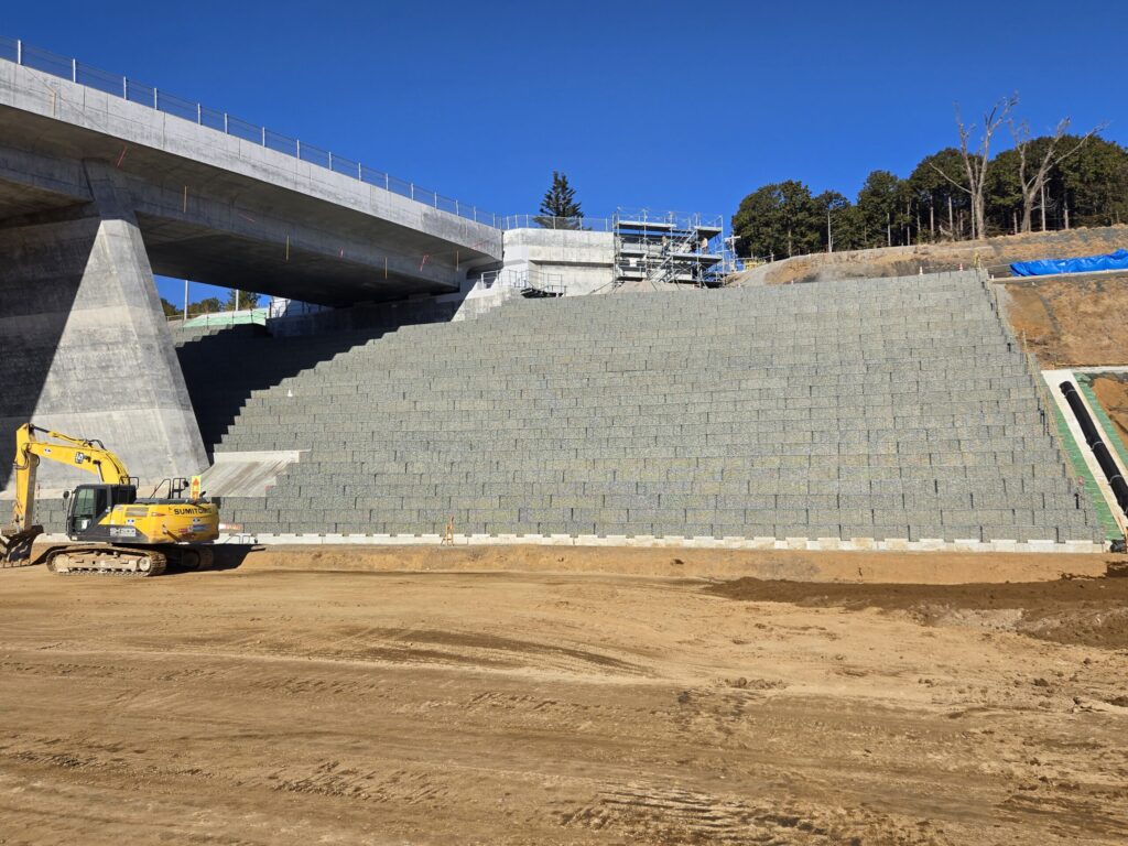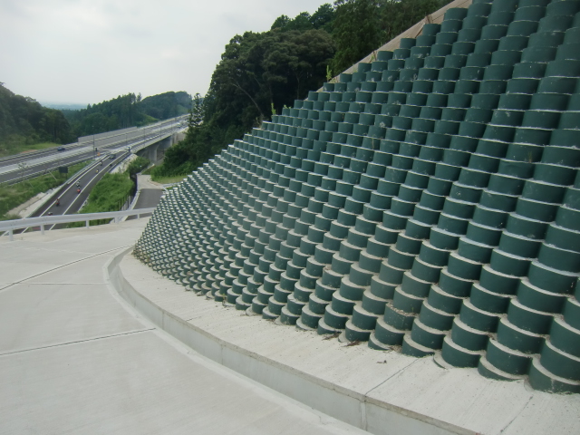 補強土壁とは、土の中に補強材(ジオグリッドや鋼材など)を敷設することで、補強材と盛土材の間の摩擦抵抗力によって盛土の安定を補い、急勾配の盛土および擁壁構造を造る構造物です。