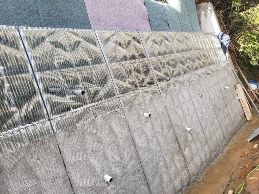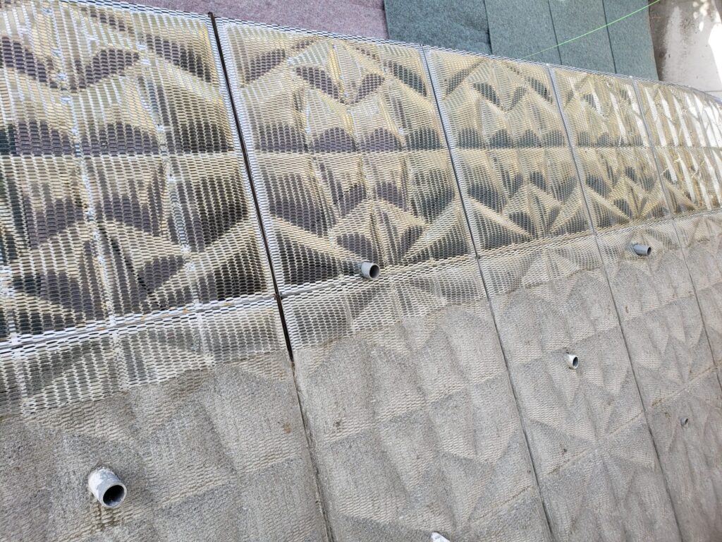デコメッシュは、コンクリートを打設した後に取り外す必要のない埋設型枠(残存化粧型枠)の一種です。埋設型枠には、装飾性の向上や施工の省力化、耐久性の確保など、用途に応じてさまざまな種類があり、デコメッシュもその中の代表的な工法として活用されています。