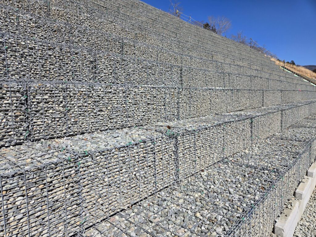 砕石カゴは小粒石対応による施工性と高耐久性を備え、吊り式省力化かご工は限られた施工スペースでも効率的かつ精度高く設置できる優れた施工性と耐久性を持つ工法です。