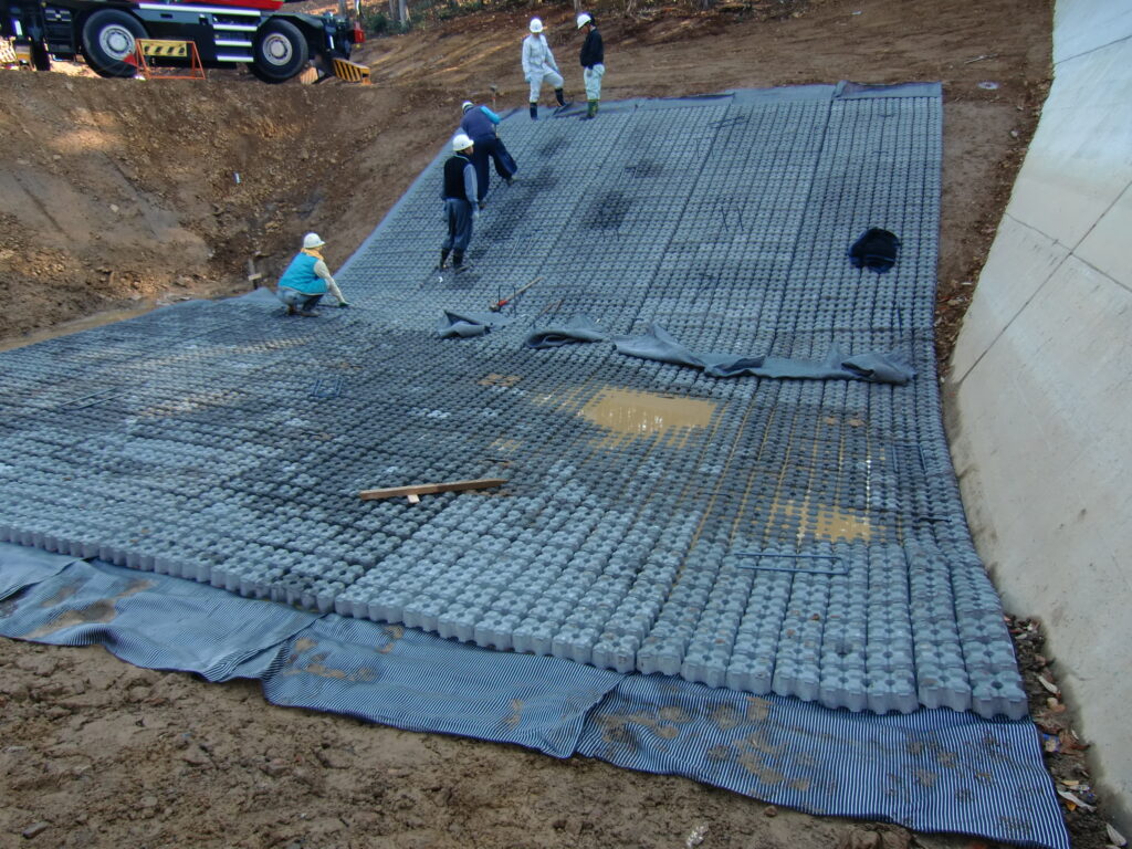 立体ジオセルは、高密度ポリエチレン(HDPE)などの耐久性に優れた樹脂を使用した、蜂の巣状の三次元構造材です。施工現場ではこのセルを広げ、セル内部に砕石、コンクリートなどの充填材を詰め込むことで、高強度な構造体を形成する工法です。